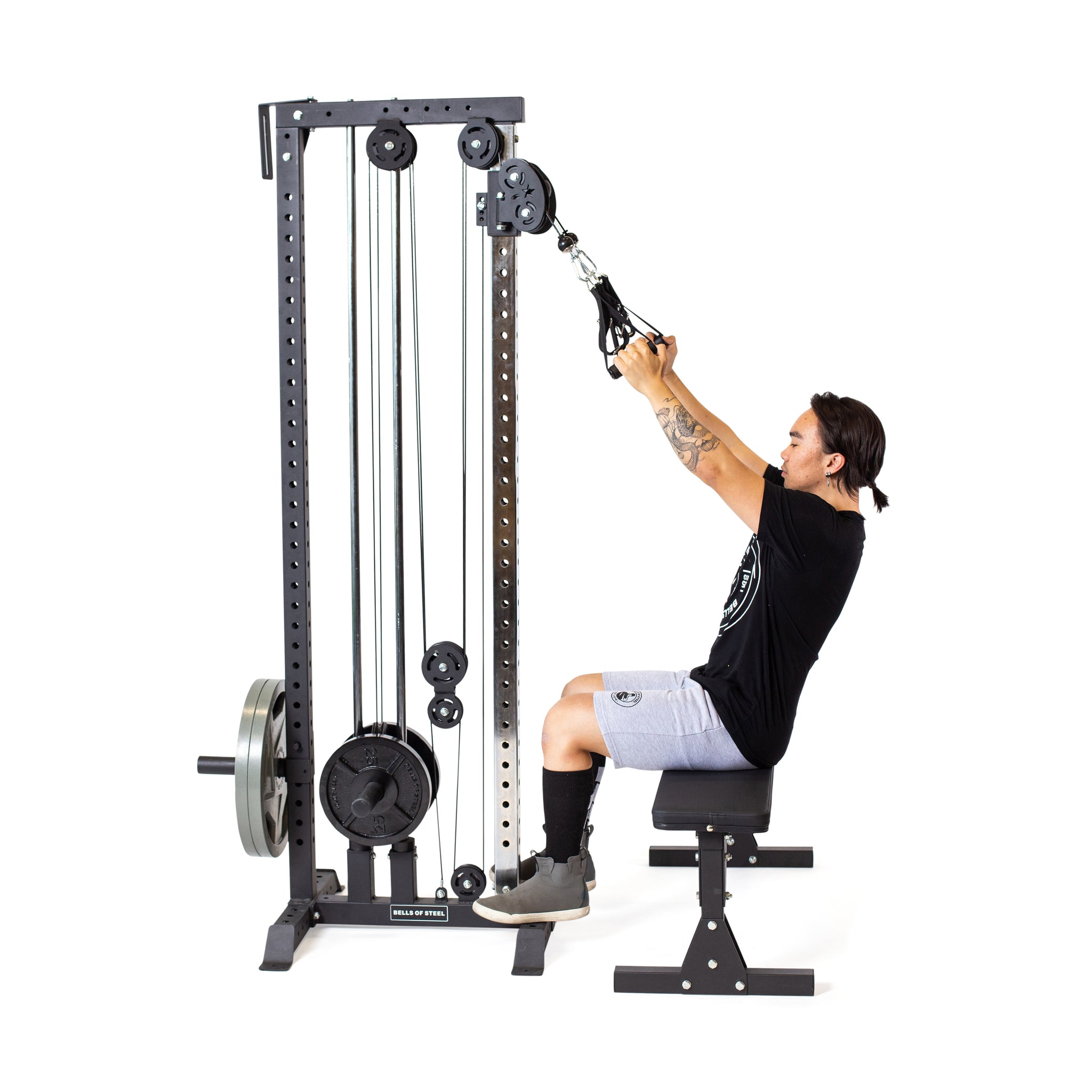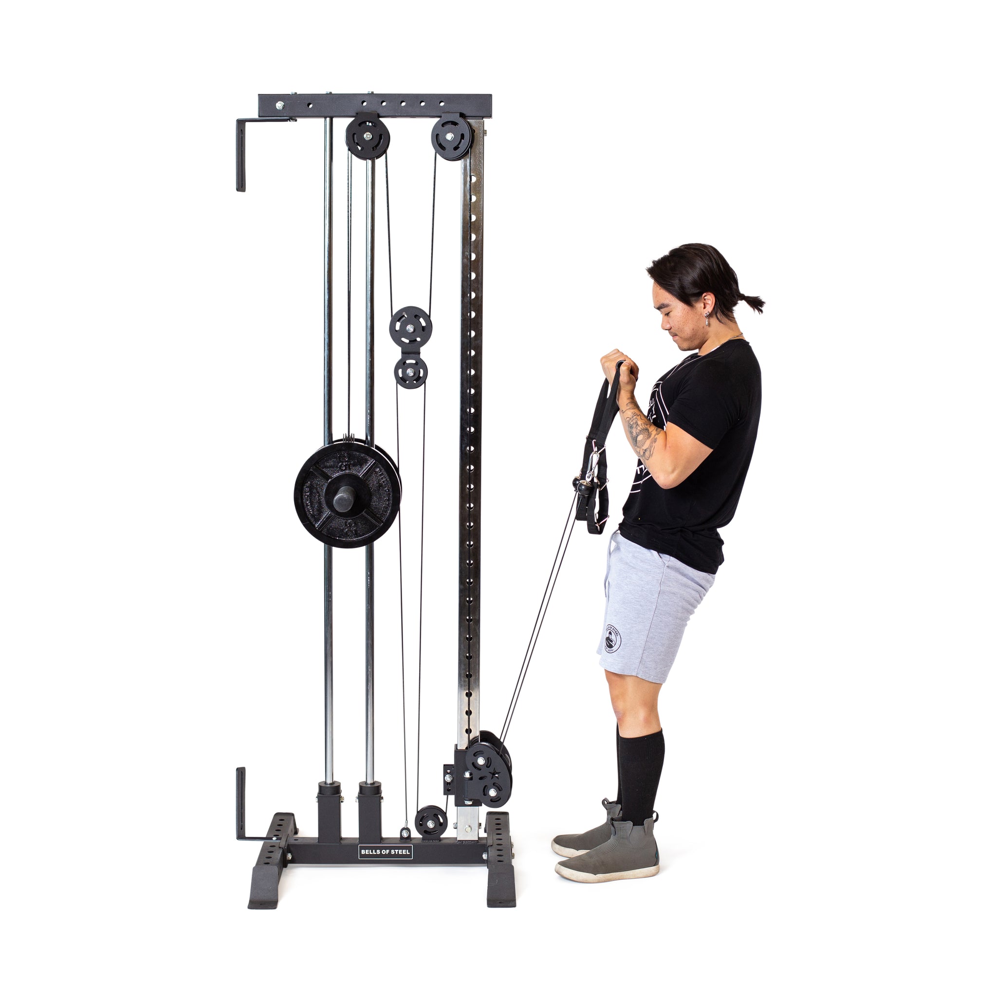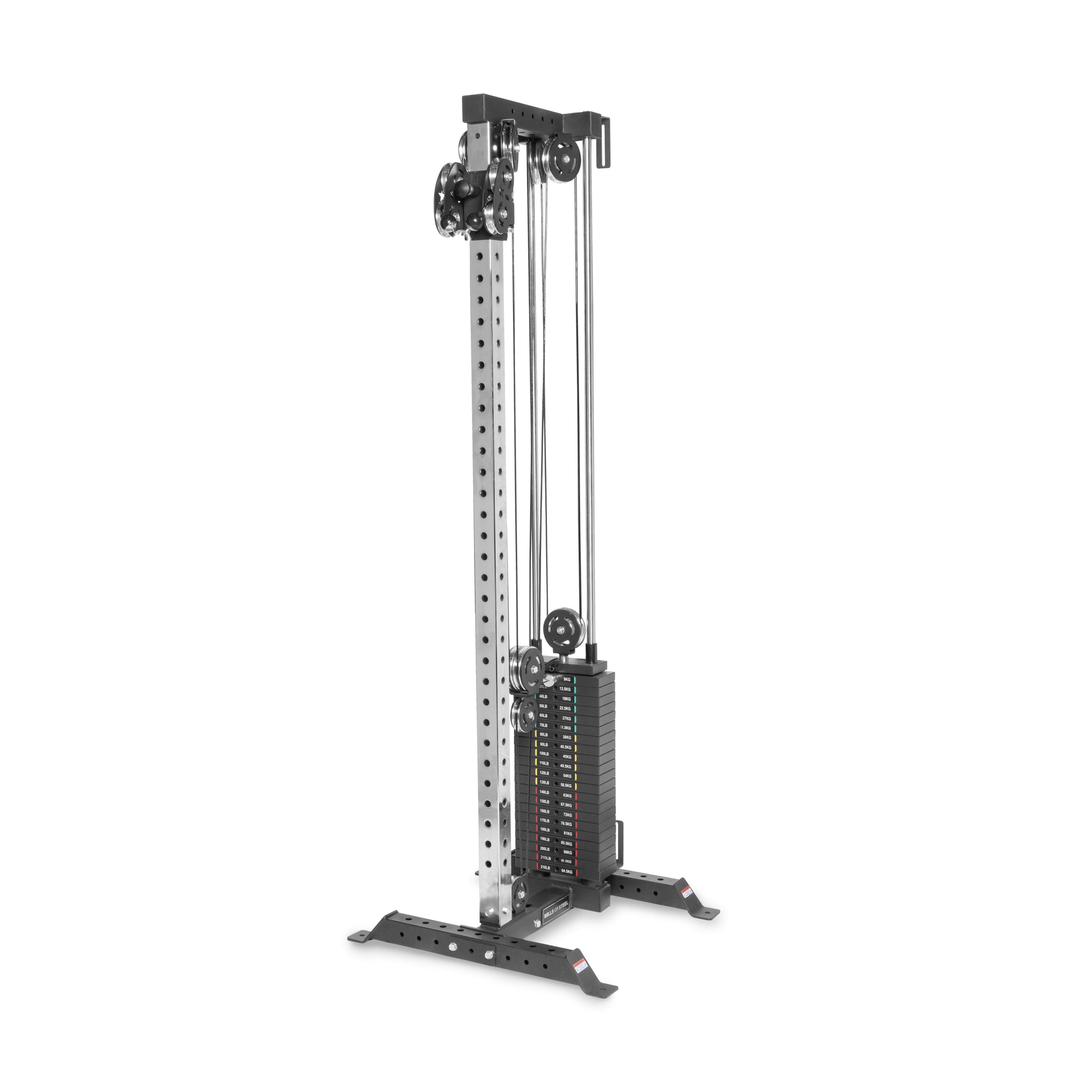 The Bells of Steel Cable Tower is a black and silver strength training machine featuring adjustable pulleys, a weight stack, and two single-grip handles.