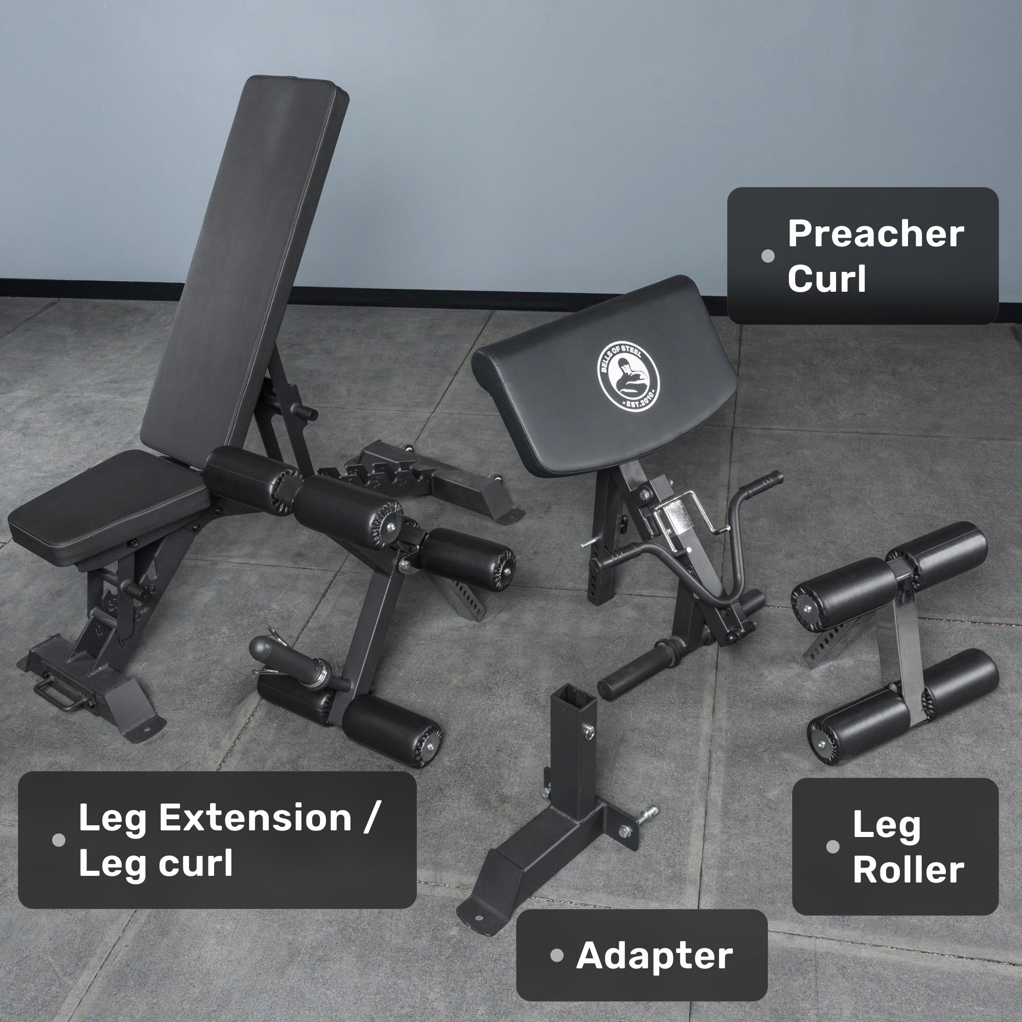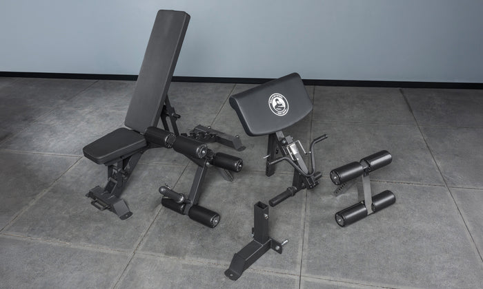 Turn one bench into a multi-function training station. Compatible add-on attachments add preacher curls, leg extensions and curls, decline sit-ups, and Bulgarian split squat capability, without sacrificing stability.