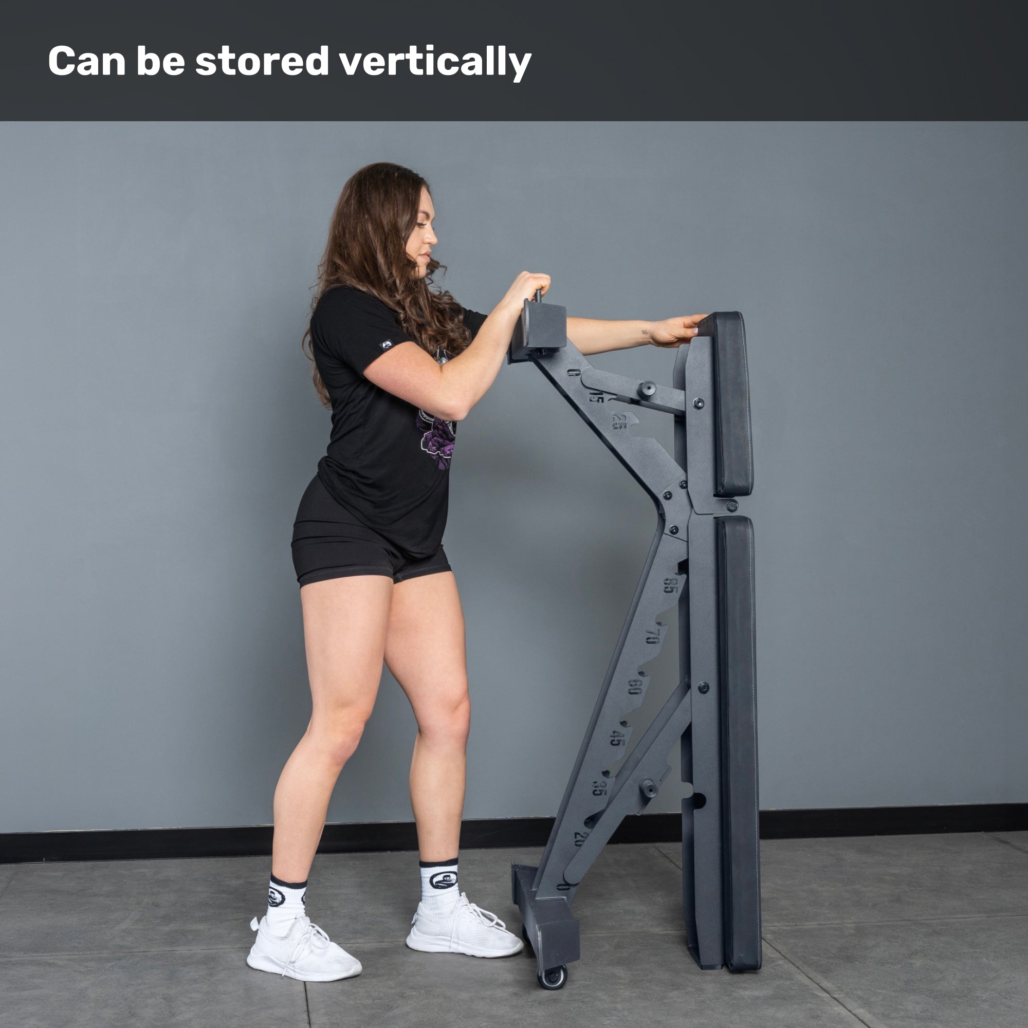 IMPORTANT: If storing vertically, ensure your floor is level. Uneven flooring may cause the bench to fall when stored upright.