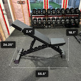 The Buzz-Saw Bench is constructed from thick 11-gauge steel tubing with reinforced weld points to maximize rigidity and long-term structural integrity. The wide front foot and rear stabilizer design distribute load evenly, reducing movement under dynamic pressing and incline work.