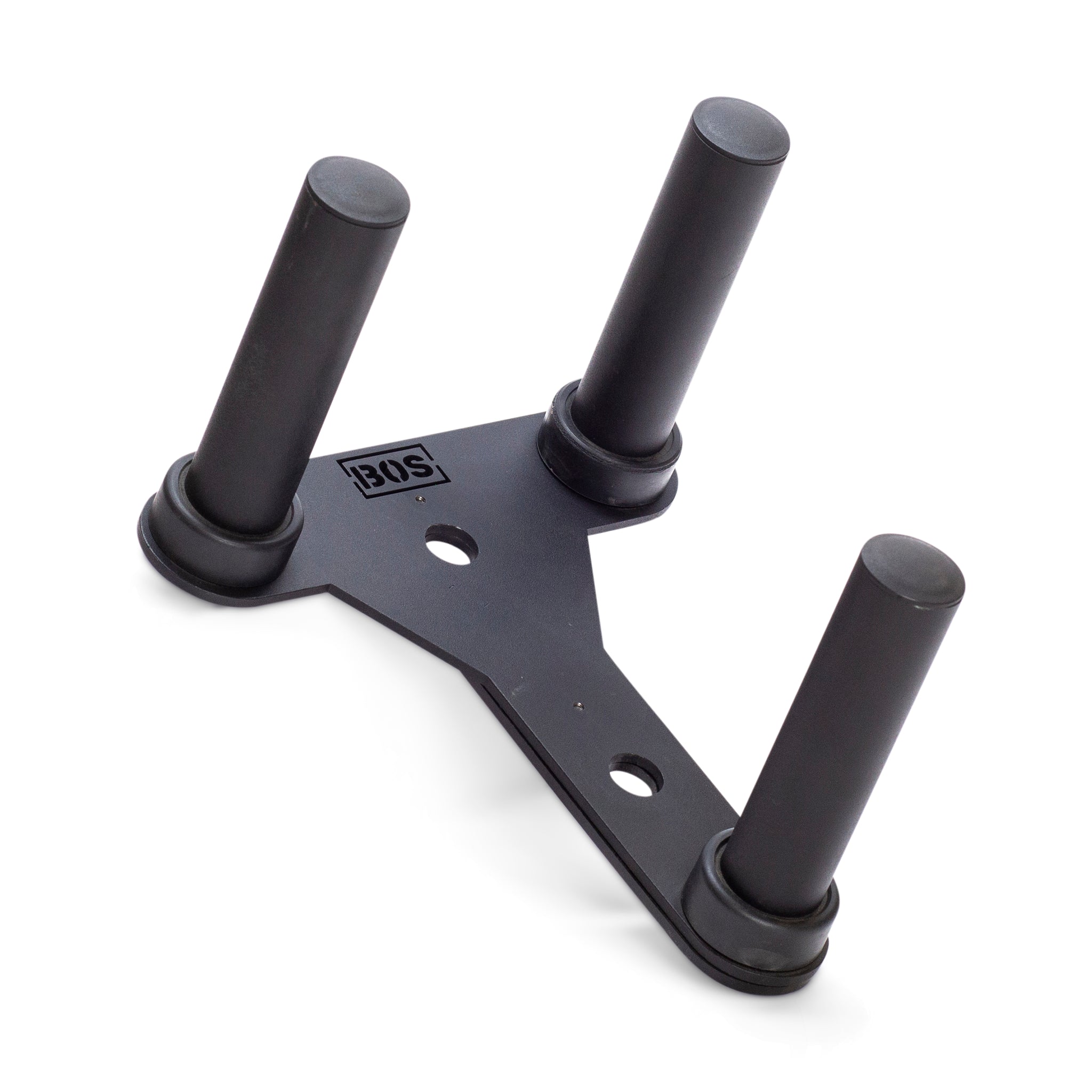 The Bells of Steel Change Plate Storage Pegs is a black metal wall mount with three cylindrical pegs in a triangular layout for holding Olympic change plates. It features two mounting holes and an upside-down "SIS" logo at the base.