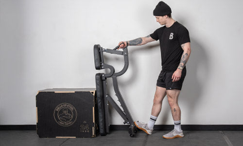 IMPORTANT: If storing vertically, ensure your floor is level. Uneven flooring may cause the bench to fall when stored upright. Alternatively, use a bench hanger.
