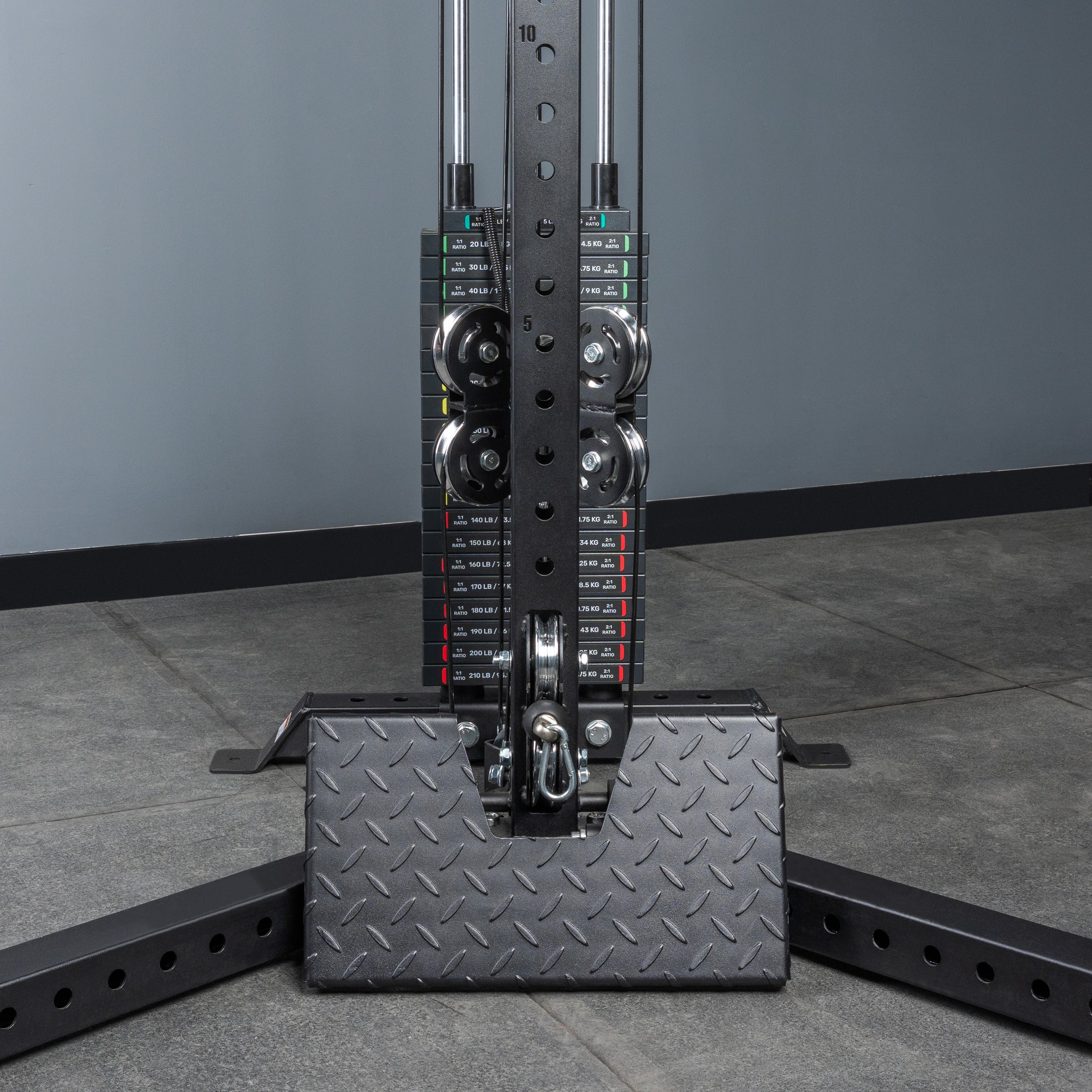 The two side cables feature a 2:1 pull ratio, making them great for lighter isolations like curls, tricep pushdowns, and chest flies. Meanwhile, the centre cables feature a 1:1 pull ratio — excellent for heavy back work like lat pulldowns & low rows.