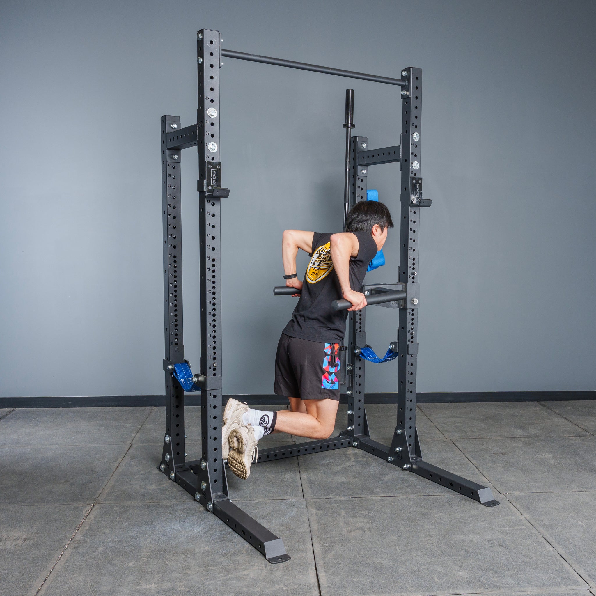 With the flat foot support system, you won't have to bolt your rack into your floor (or hire a contractor). The larger contact surface area makes the rack sturdier for racking/unracking your bar, during pull-ups, and when doing dips.